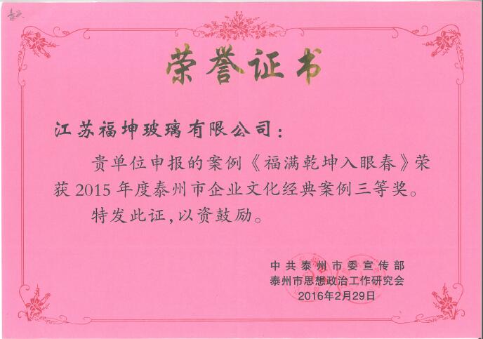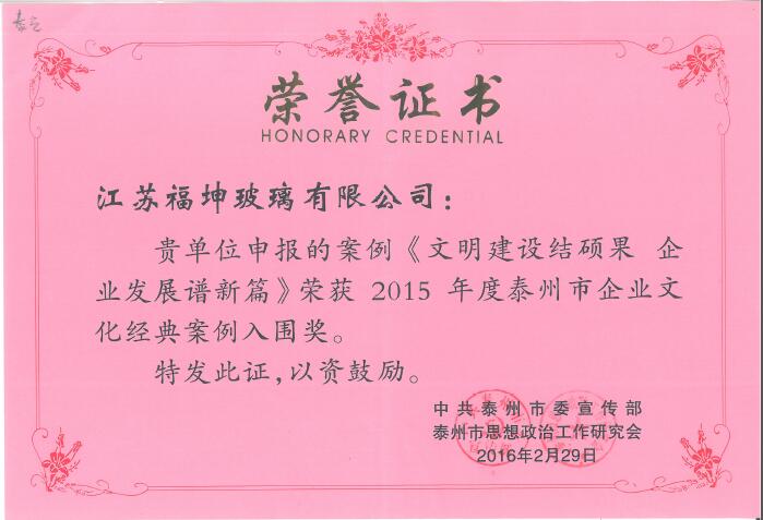 | 7月17日,我司行政部撰寫的企業(yè)文化建設(shè)案例《文明建設(shè)結(jié)碩果 企業(yè)發(fā)展譜新篇》榮獲2015年度泰州市企業(yè)文化建設(shè)經(jīng)典案例入圍獎;
