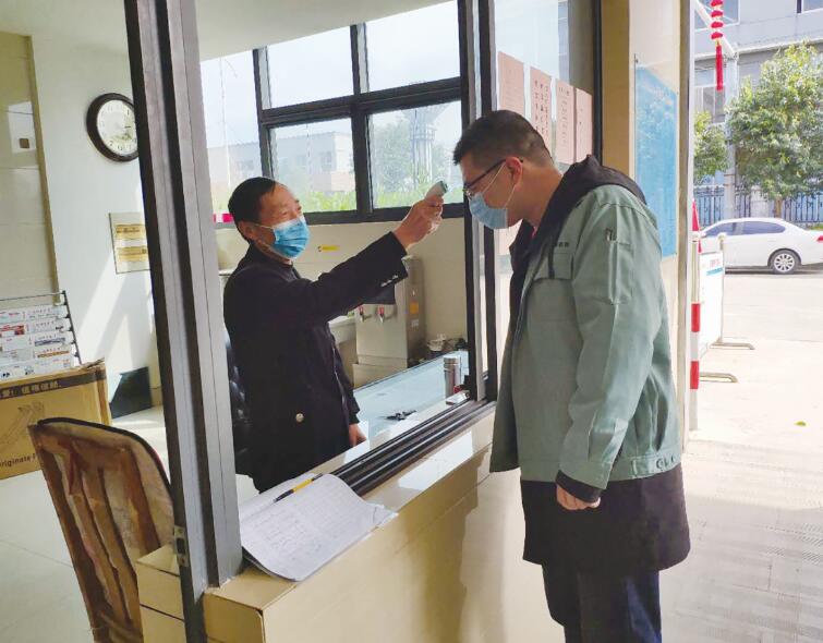 3月13日,福坤玻璃門衛室。“請問您找誰?有什么事?”,“我找采購部某某”,在得到來人的回答后,門衛人員積極引導來客進行體溫測量和信息登記。