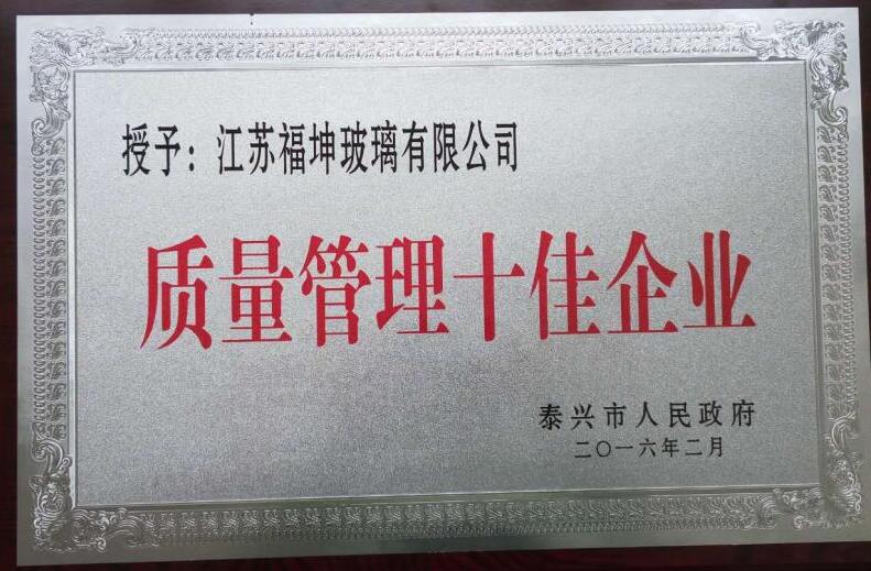 6月7日,泰興市全市質量提升暨質量強鎮(園區、街道)、質量強企、質量強業工作推進會傳來喜訊:泰興市人 民 政 府授予江蘇福坤玻璃有限公司“質量管理十佳企業”榮譽稱號,行政部張濤代表公司領 取了牌匾。